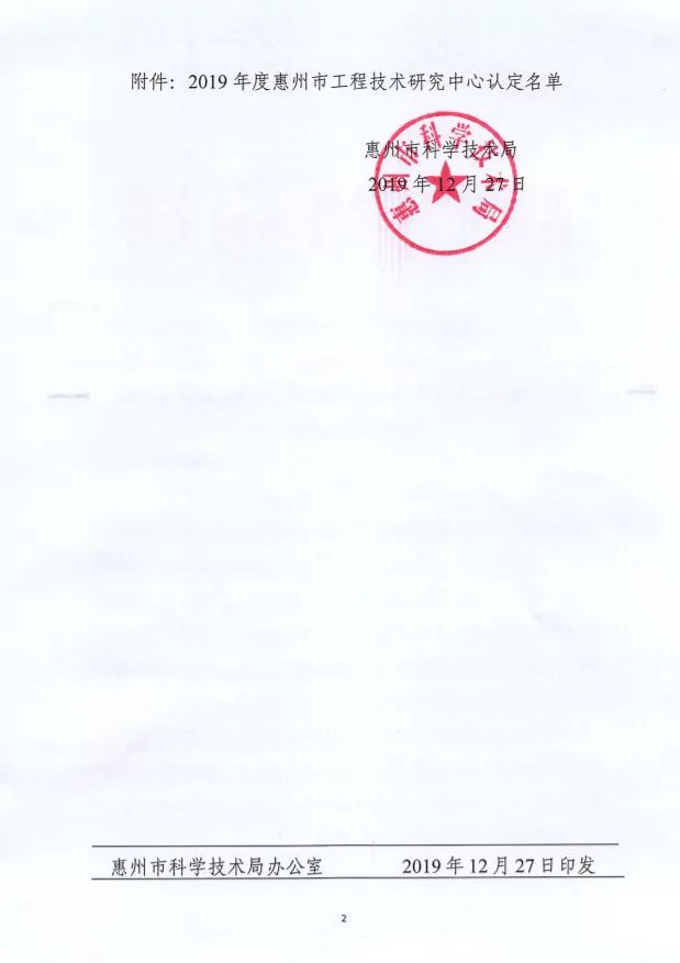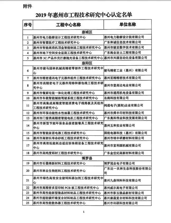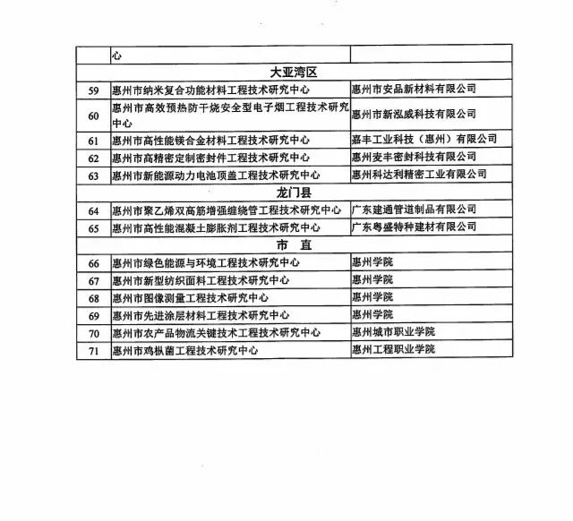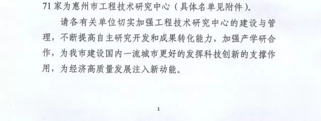 为深入实施创新驱动发展战略,加快推进企业研发机构建设,充分发挥市工程技术研究中心在促进科技创新、推动成果转化及产业化的示范和带动作用,按照开展2019年度工程中心申报通知和相关管理办法的要求,经专家评审和局务会研究,现认定惠州市电力勘察设计工程技术研究中心等71家为惠州市工程技术研究中心(具体名单见附件)。