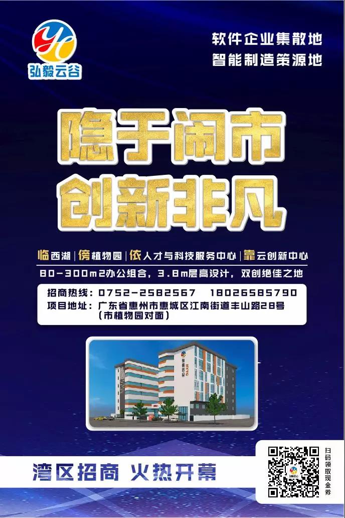 弘毅云谷,位于惠州市植物园正对面,毗邻惠州西湖,产业园以“云计算、大数据、软件与现代信息服务业”理念规划,打造科创智谷、人才与科技服务中心、云创新中心、软件研发与培训中心、网络空间安全服务中心等“一谷四中心”全产业生态;与创新、创业、产业配套等多元业态有机组合,构建人才引进与培育、软件研发与智造融合、技术重构与流程优化、网络安全与科技服务等生态相融的智慧园区,力争成为“软件企业集散地·智能制造策源地”。